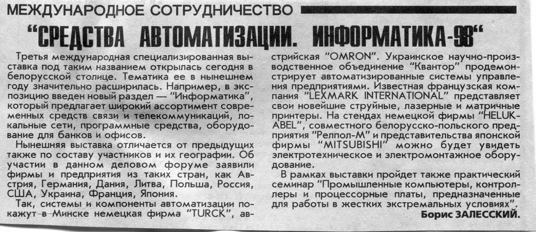 Залесский, Б. "Средства автоматизации. Информатика-98" / Б. Залесский // Вечерний Минск. - 1998. - 24 мар.