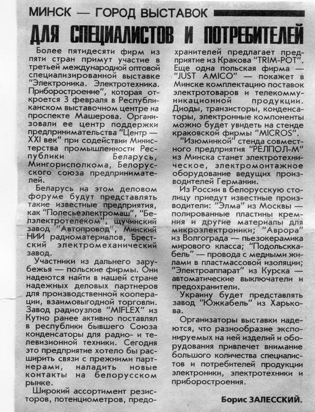 Залесский, Б. Для специалистов и потребителей / Б. Залесский // Вечерний Минск. - 1998. - 30 янв.