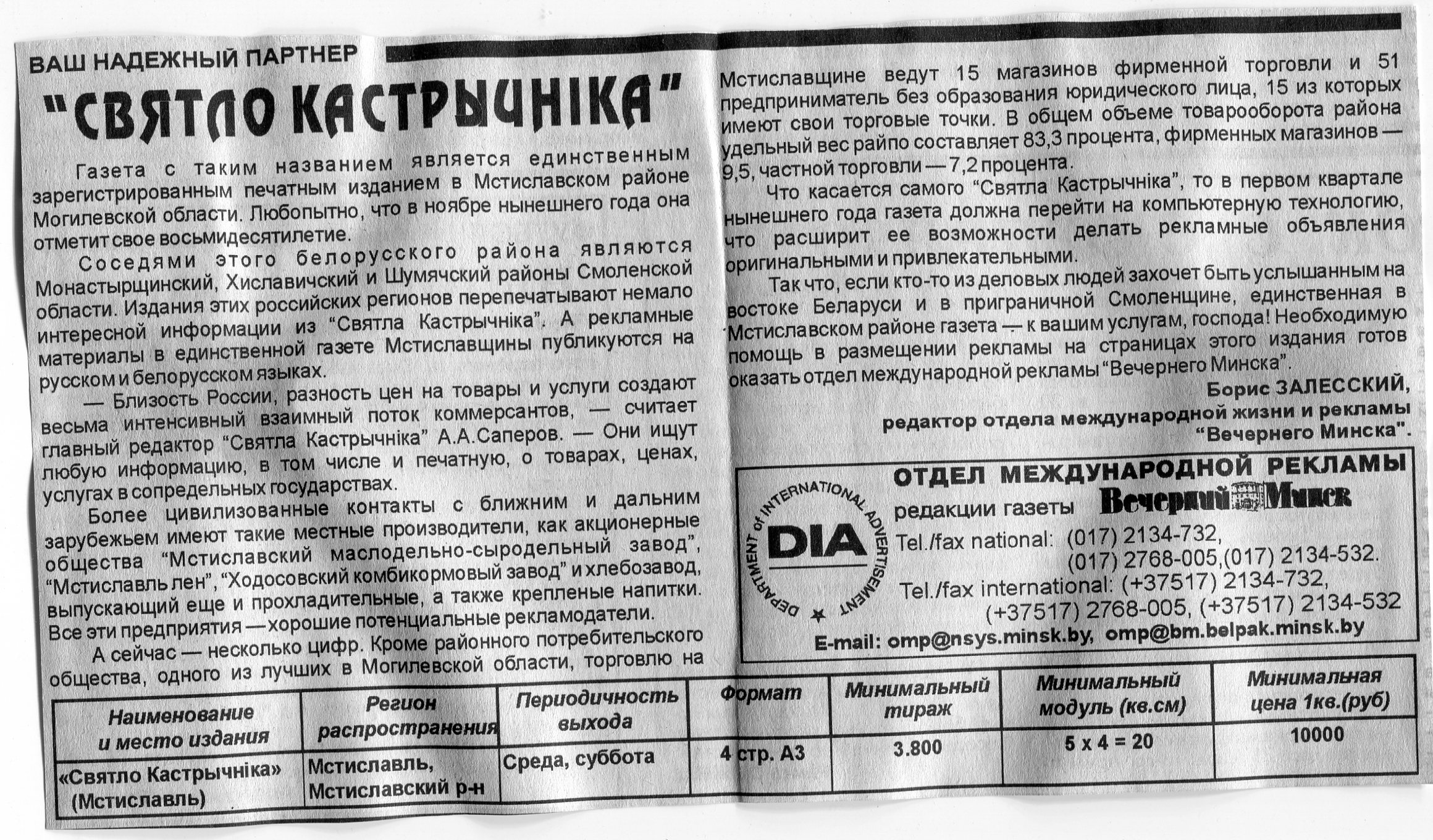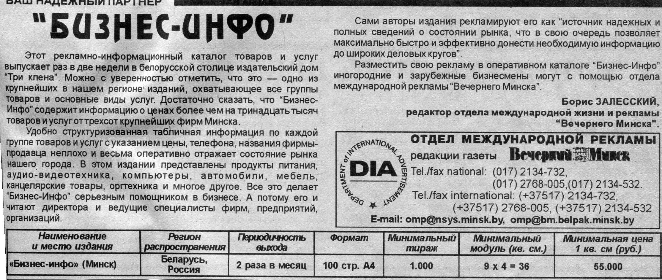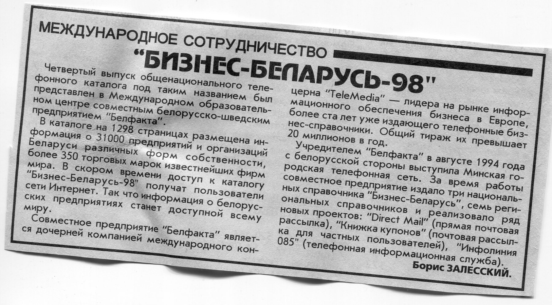 Залесский, Б. "Бизнес-инфо" / Б. Залесский // Вечерний Минск. – 1998. – 22 янв.