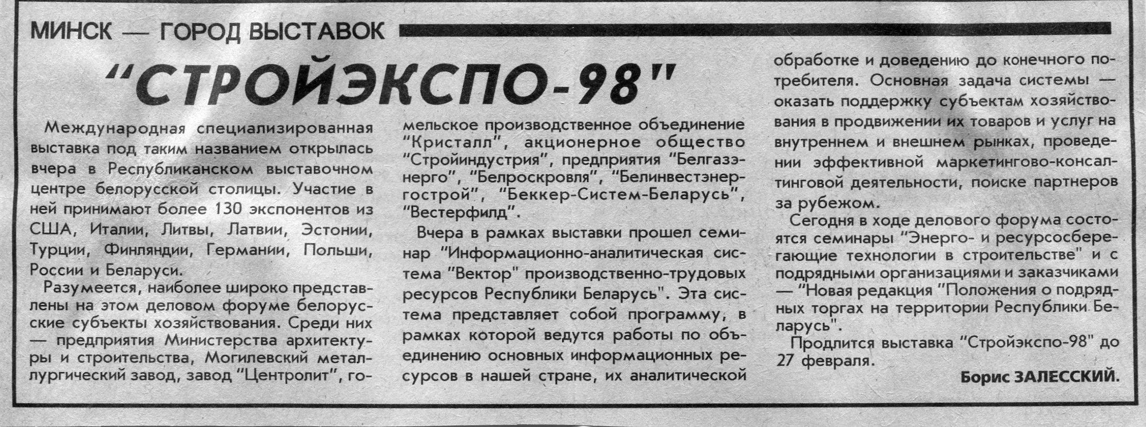Залесский, Б. "Стройэкспо-98" / Б. Залесский // Вечерний Минск. - 1998. - 25 февр.