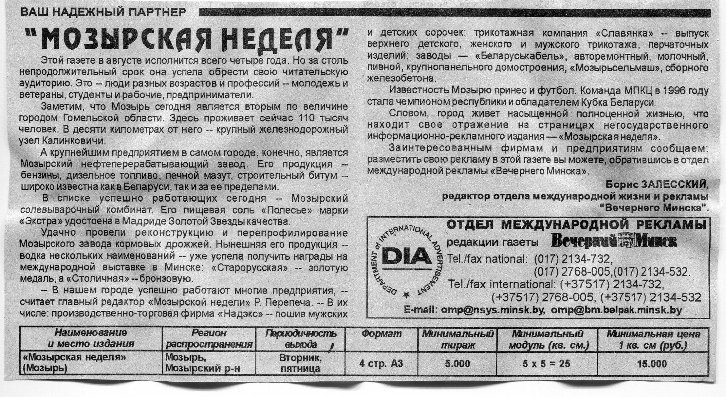 Залесский, Б. "Мозырская неделя" / Б. Залесский // Вечерний Минск. – 1998. – 1 апр.