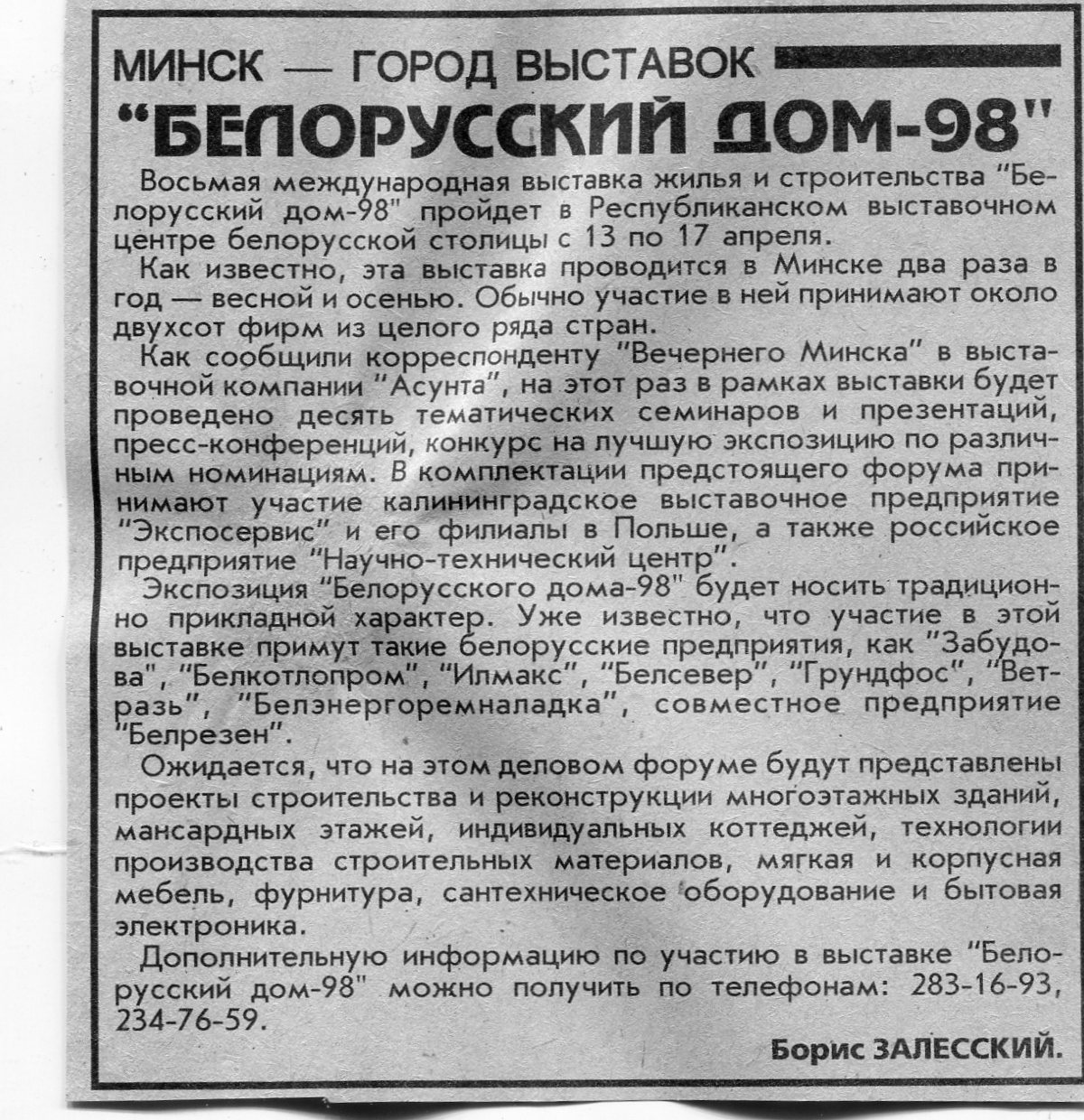 Залесский, Б. "Белорусский дом-98" / Б. Залесский // Вечерний Минск. - 1998. - 11 февр.