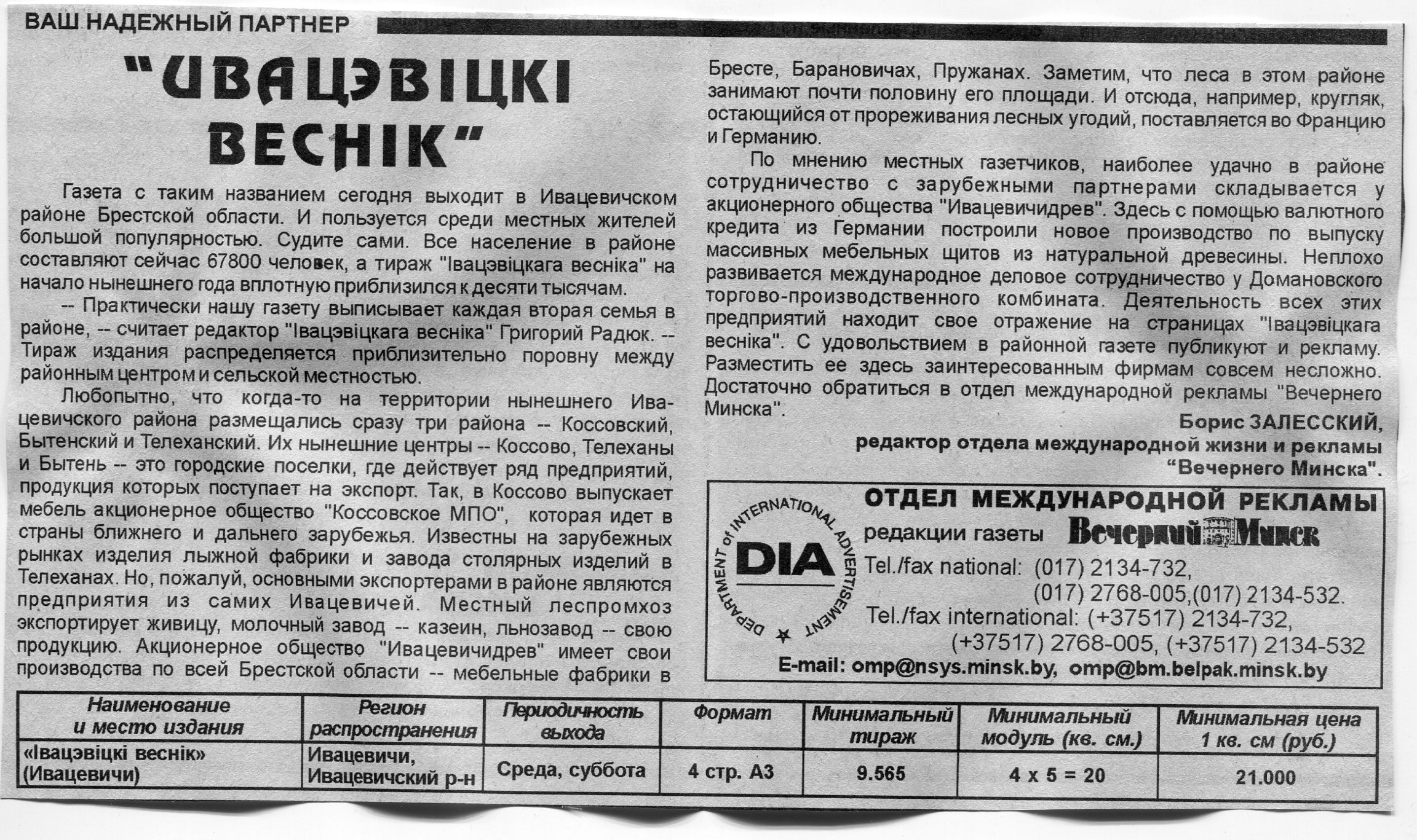 Залесский, Б. "Івацэвіцкі веснік" / Б. Залесский // Вечерний Минск. – 1998. – 5 февр.