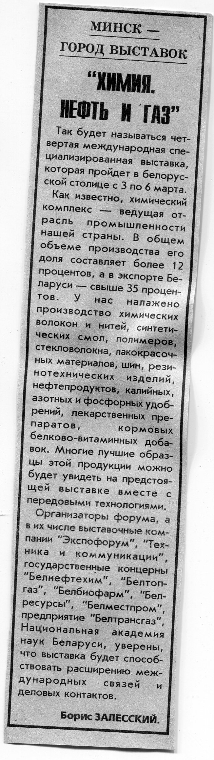 Залесский, Б. "Химия. Нефть и газ" / Б. Залесский // Вечерний Минск. - 1998. - 20 февр.