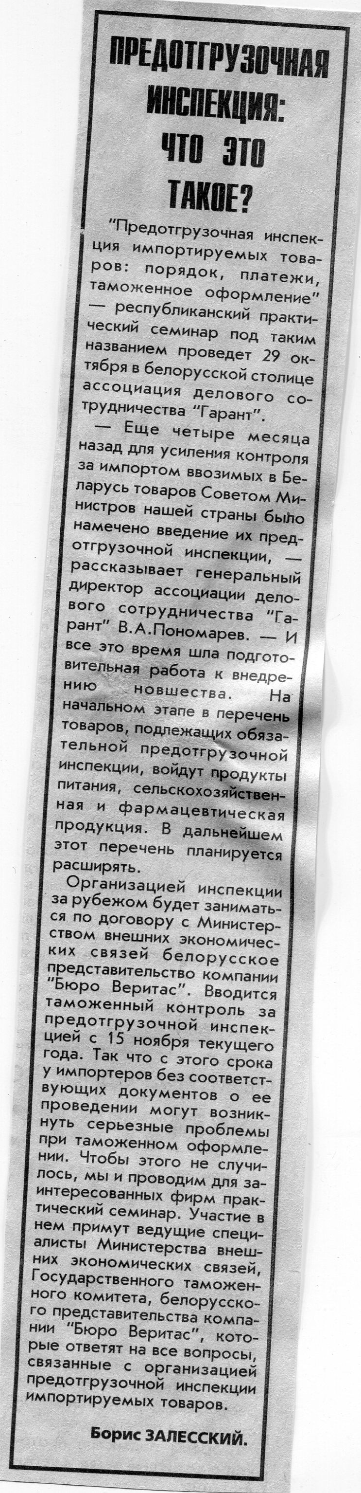Залесский, Б. Предотгрузочная инспекция: что это такое? / Б. Залесский // Вечерний Минск. - 1997. - 24 окт.