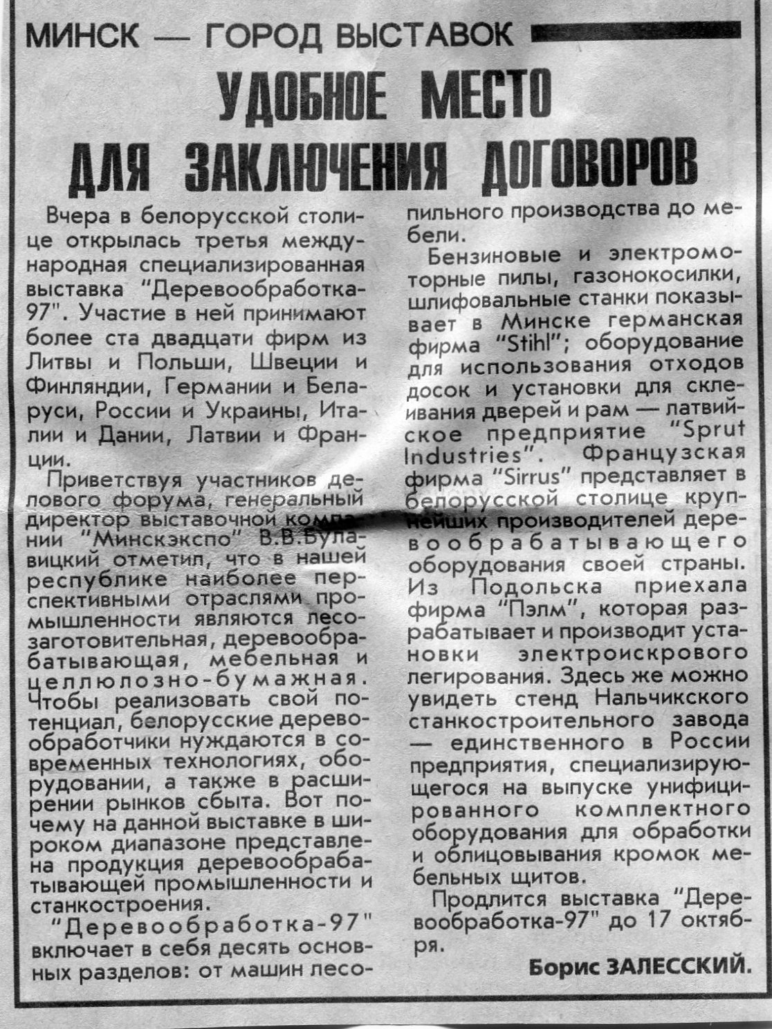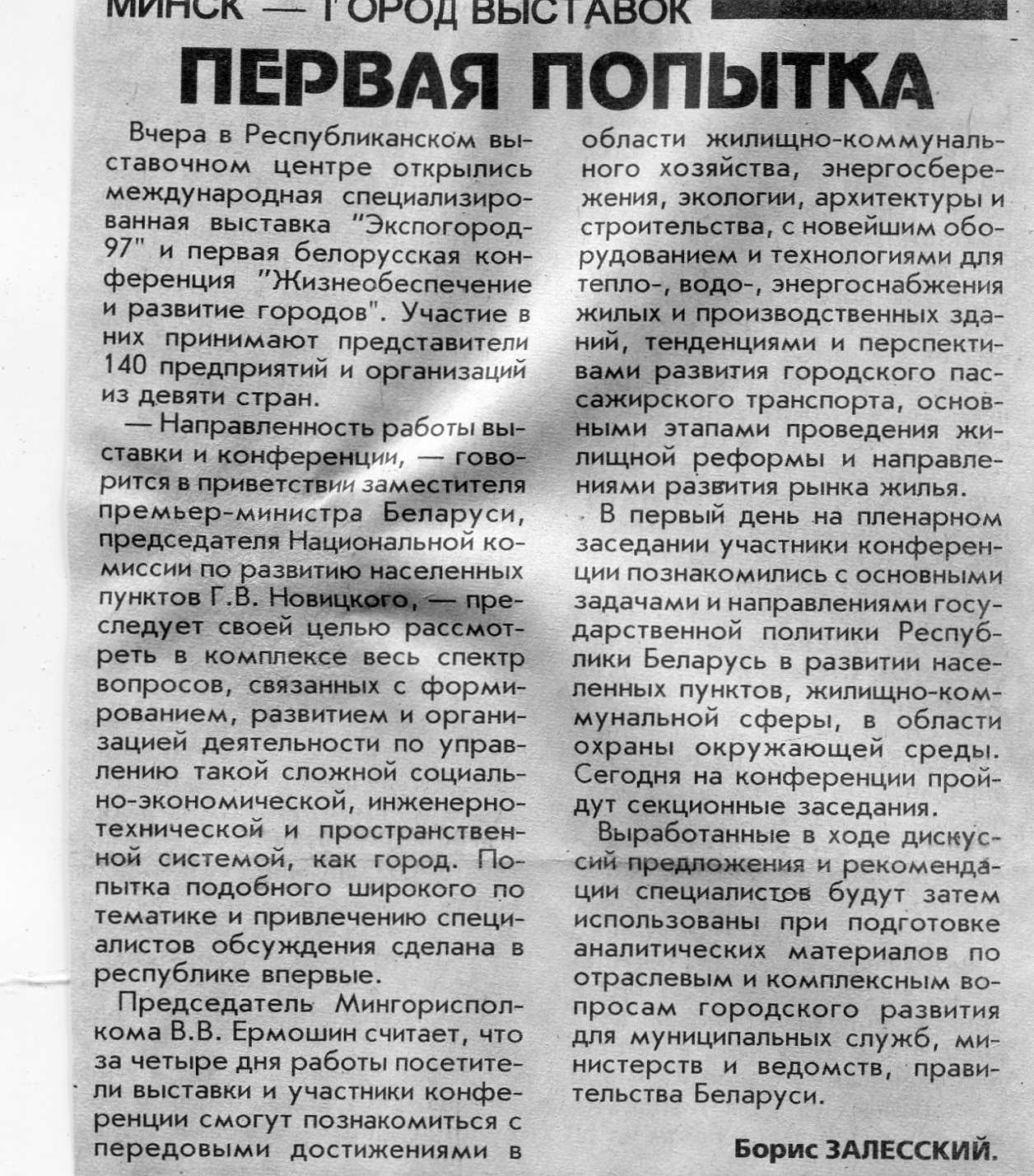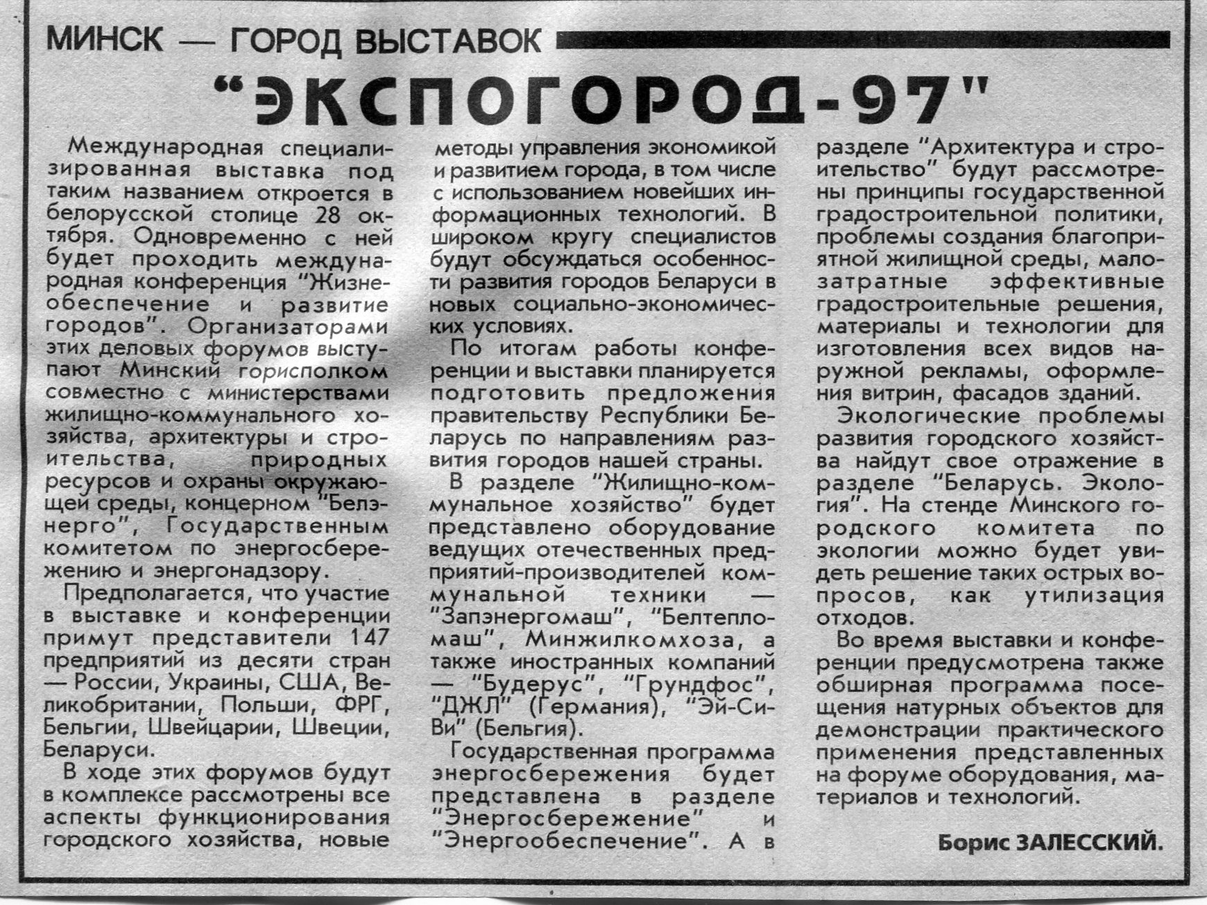Залесский, Б. "Экспогород-97" / Б. Залесский // Вечерний Минск. - 1997. - 22 окт.