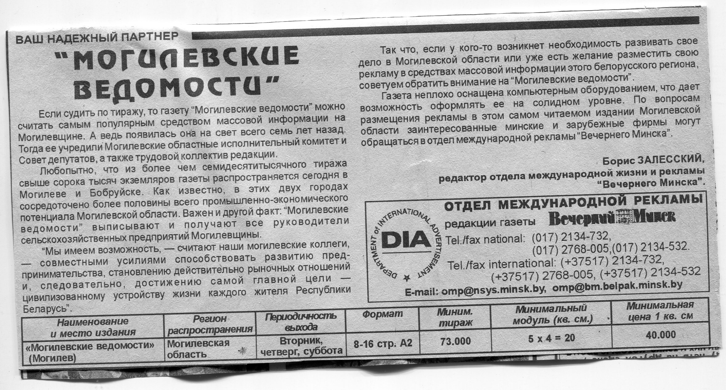 Залесский, Б. "Могилевские ведомости" / Б. Залесский // Вечерний Минск. – 1997. – 30 дек.