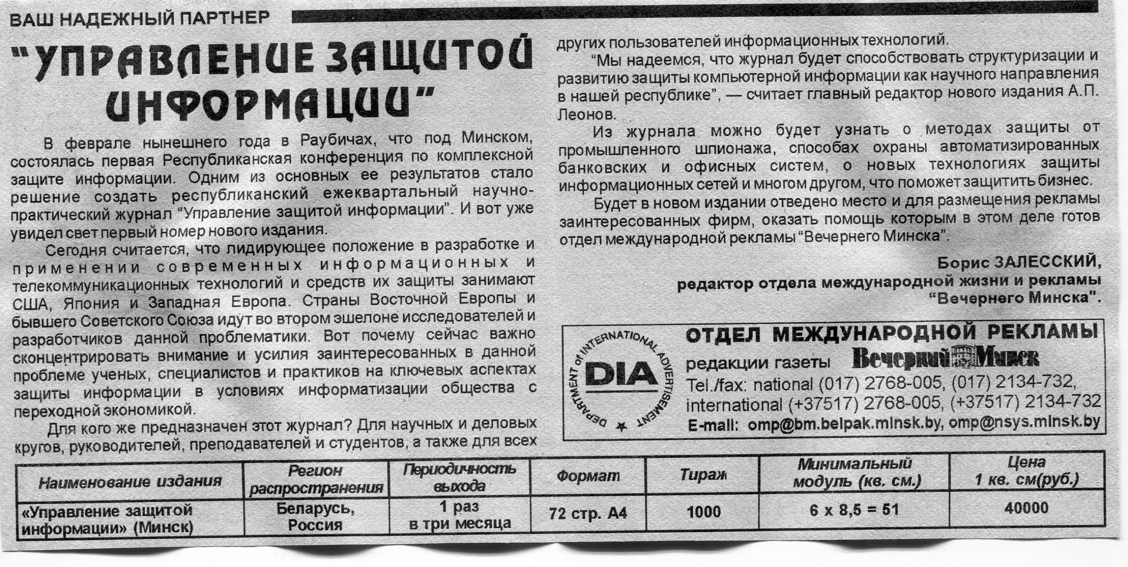 Залесский, Б. "Управление защитой информации" / Б. Залесский // Вечерний Минск. – 1997. – 16 дек.