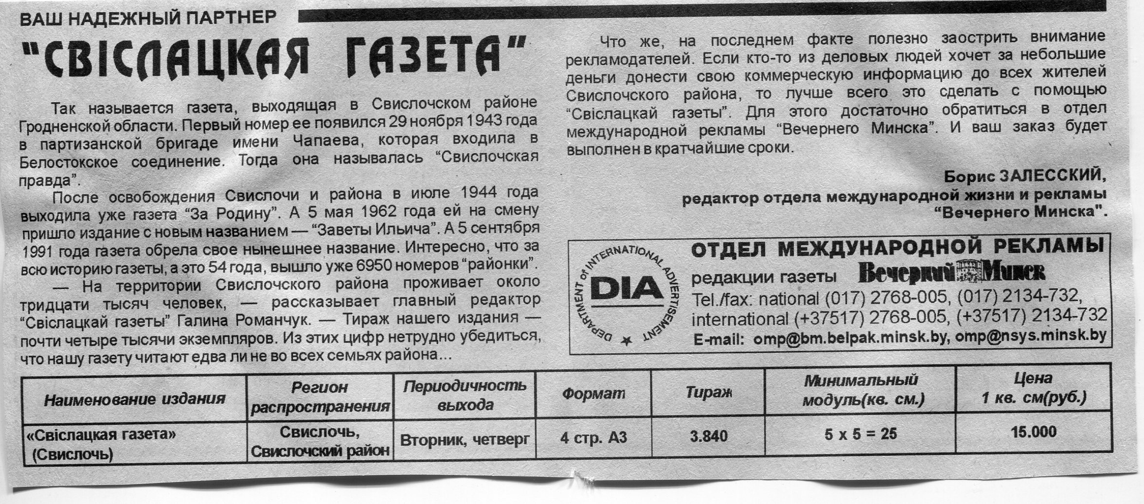 Залесский, Б. "Свіслацкая газета" / Б. Залесский // Вечерний Минск. - 1997. - 12 нояб.