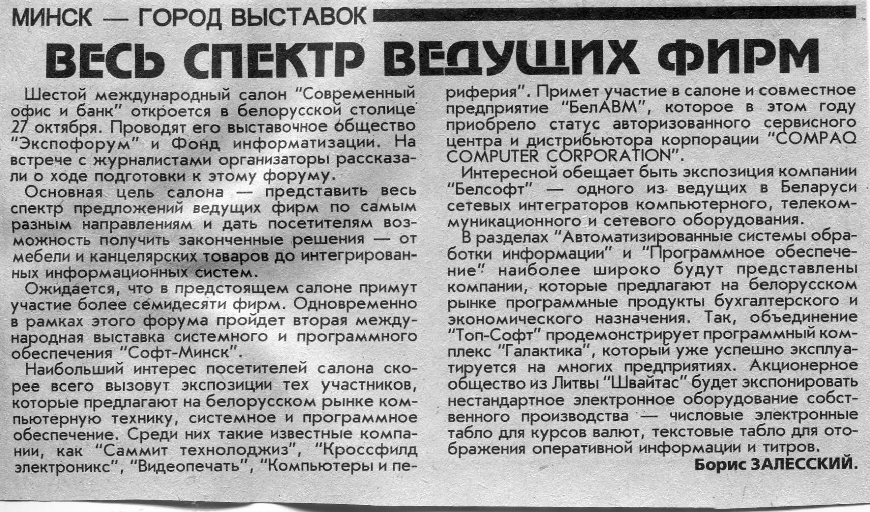 Залесский, Б. Весь спектр ведущих фирм / Б. Залесский // Вечерний Минск. - 1997. - 21 окт.
