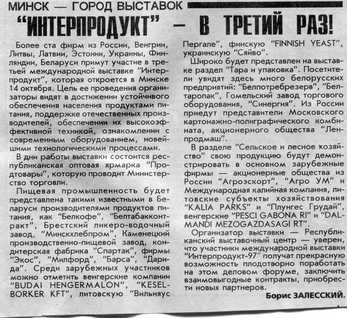 Залесский, Б. "Интерпродукт" - в третий раз! / Б. Залесский // Вечерний Минск. - 1997. - 10 окт.