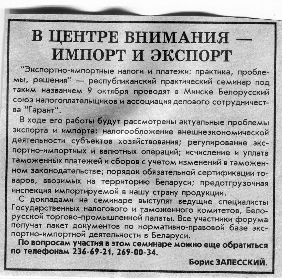 Залесский, Б. В центре внимания - импорт и экспорт / Б. Залесский // Вечерний Минск. - 1997. - 7 окт.