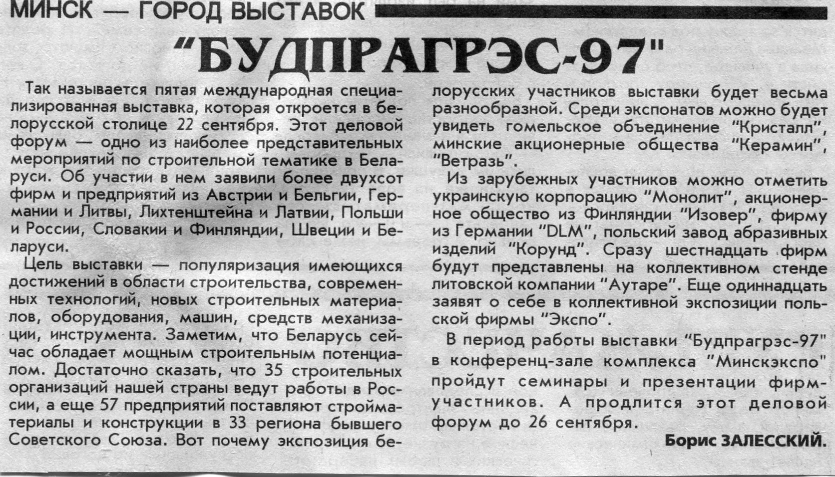 Залесский, Б. "Будпрагрэс-97" / Б. Залесский // Вечерний Минск. - 1997. - 19 сент.