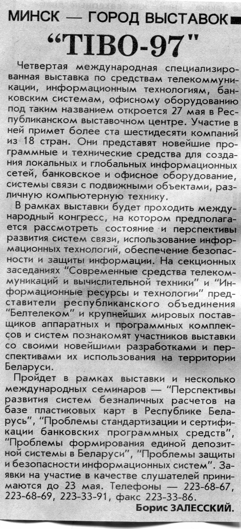 Залесский, Б. "ТIBO-97 / Б. Залесский // Вечерний Минск. - 1997. - 21 мая.