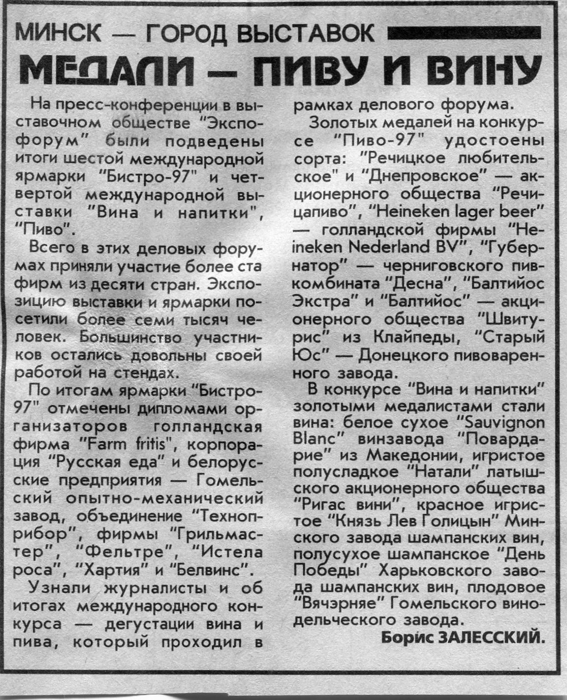 Залесский, Б. Медали - пиву и вину / Б. Залесский // Вечерний Минск. - 1997. - 14 июл.