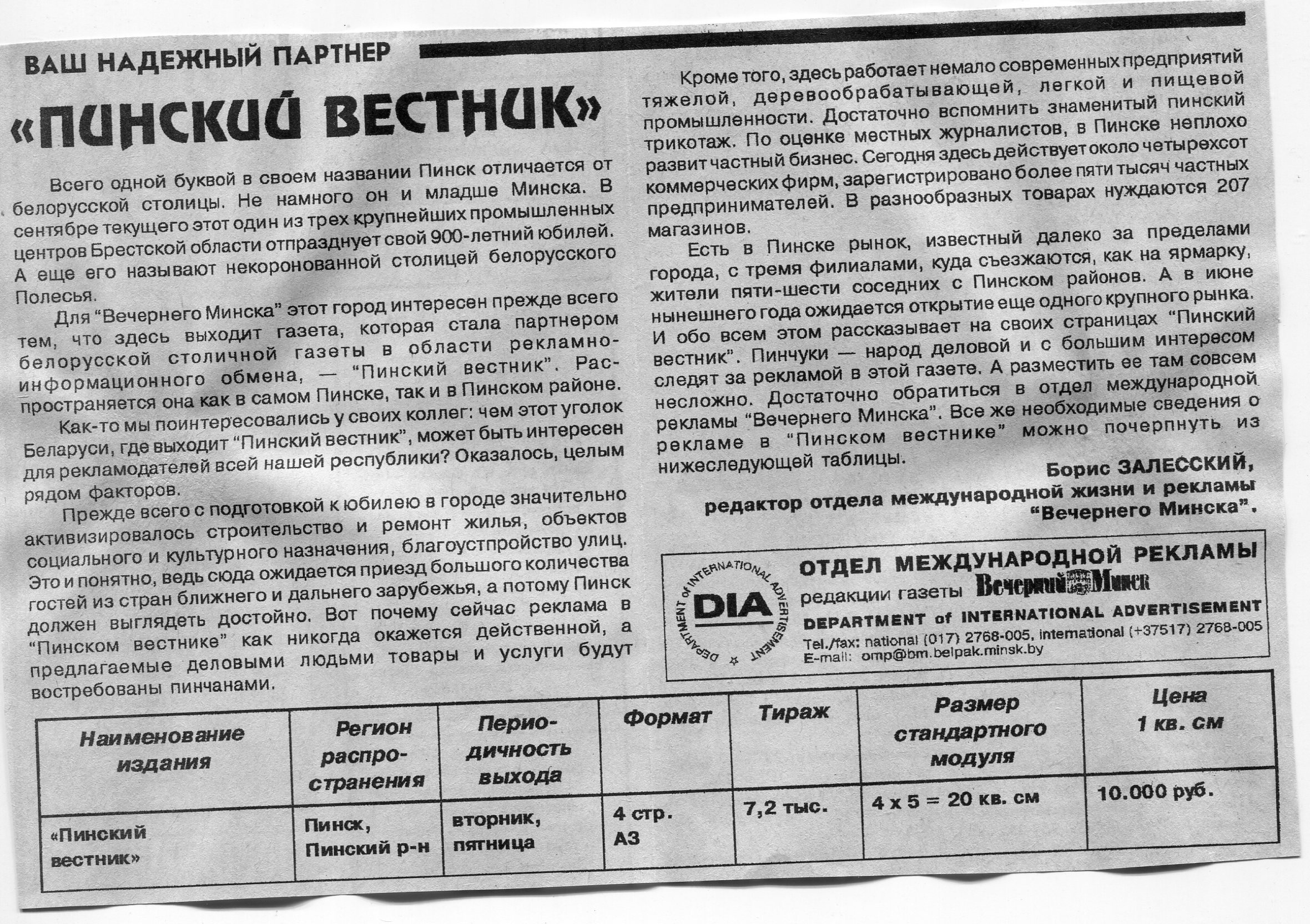 Залесский, Б. "Пинский вестник" / Б. Залесский // Вечерний Минск. - 1997. - 9 апр.