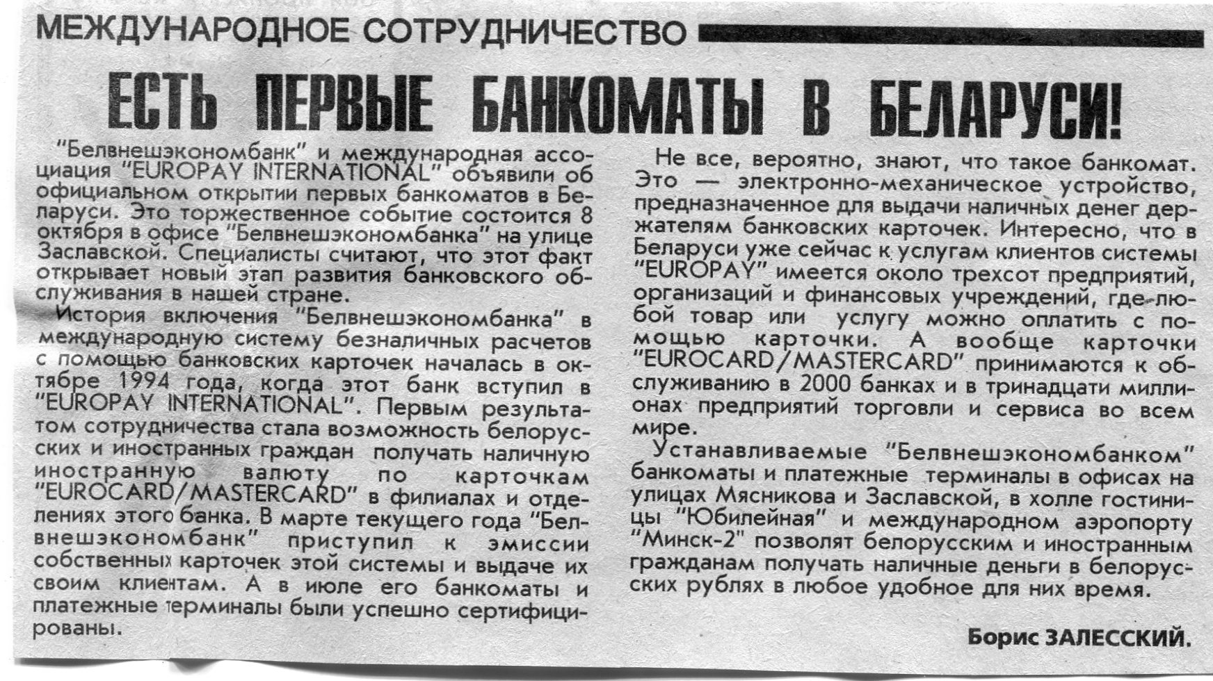 Залесский, Б. Есть первые банкоматы в Беларуси! / Б. Залесский // Вечерний Минск. - 1996. - 7 окт.