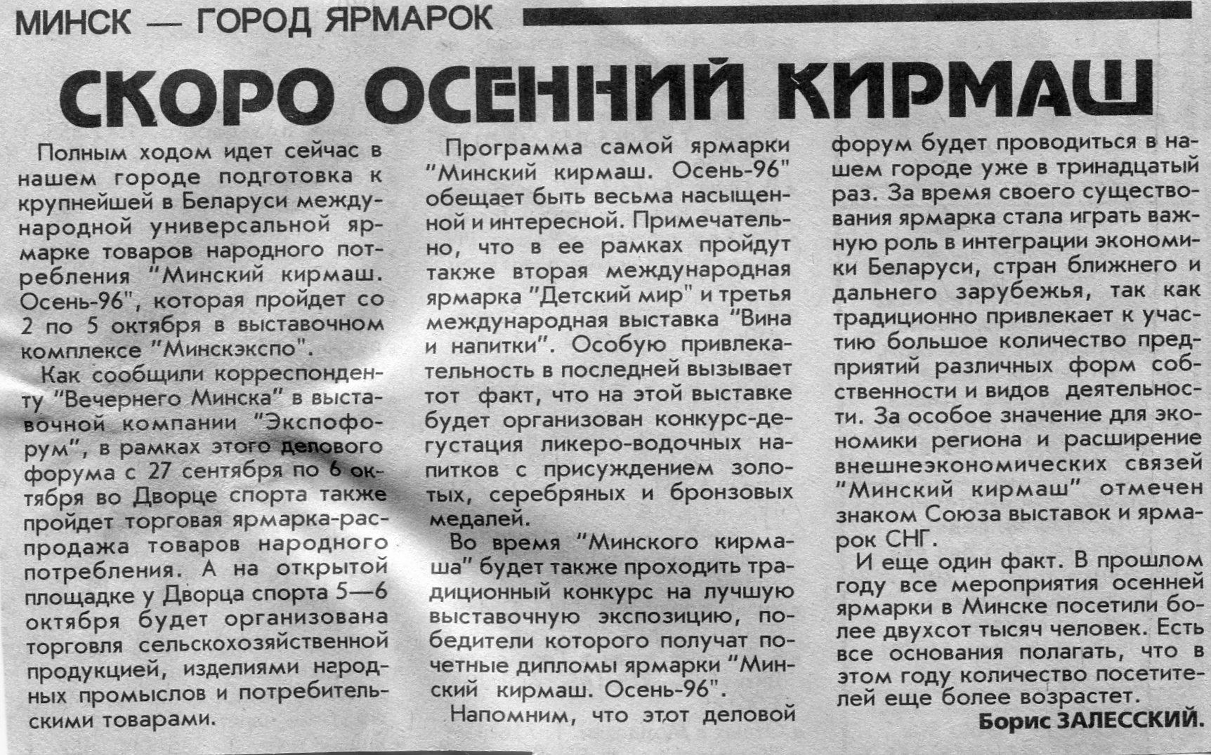Залесский, Б. Скоро осенний кирмаш / Б. Залесский // Вечерний Минск. - 1996. - 20 авг.