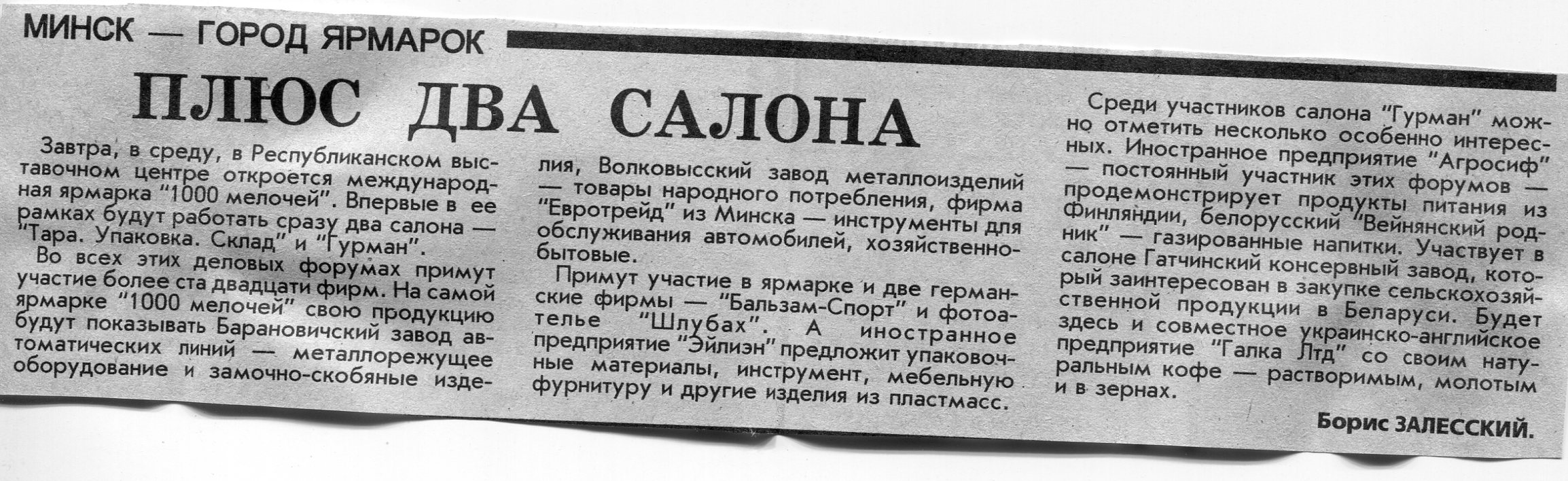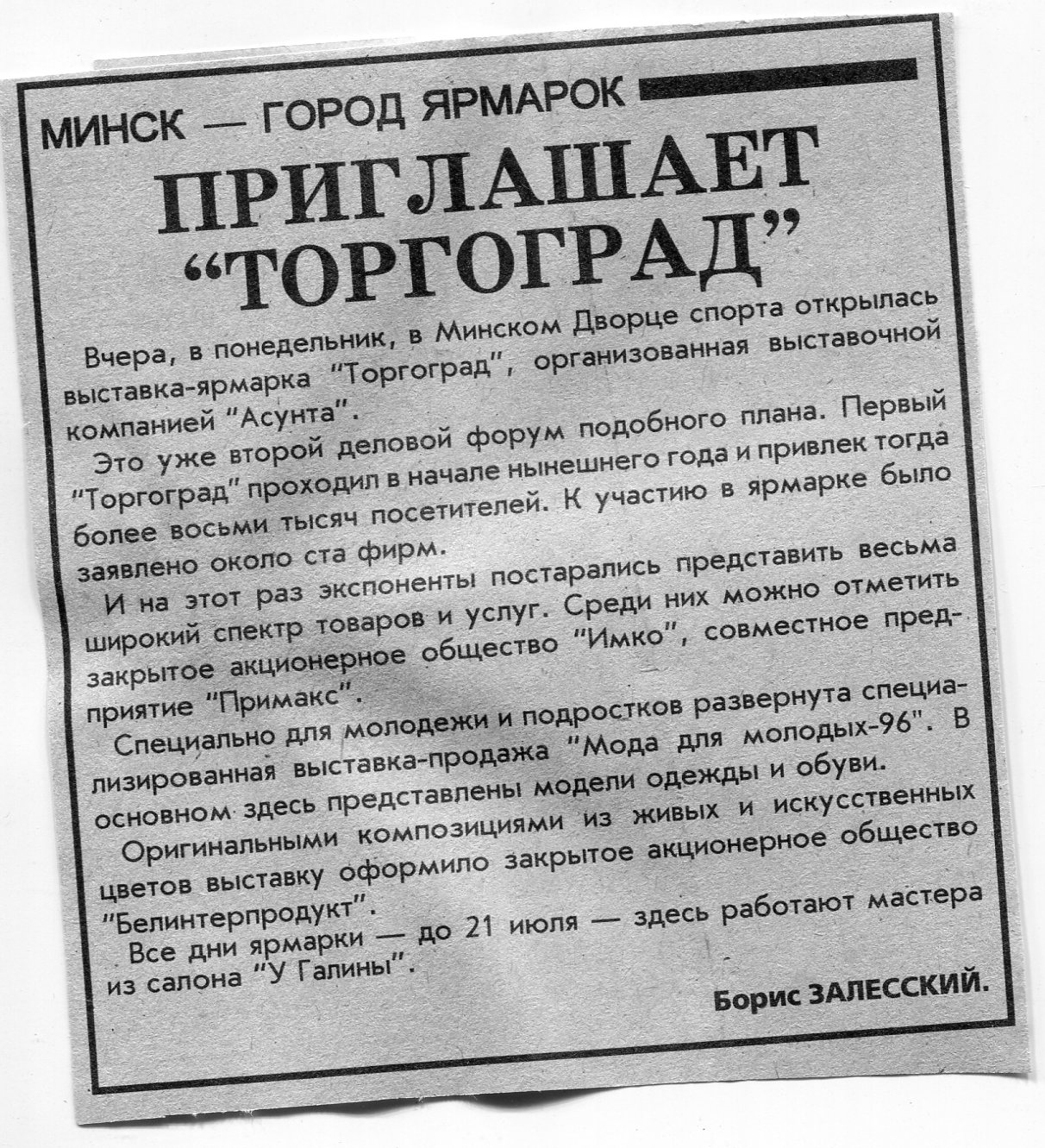 Залесский, Б. Приглашает "Торгоград" / Б. Залесский // Вечерний Минск. - 1996. - 16 июл.