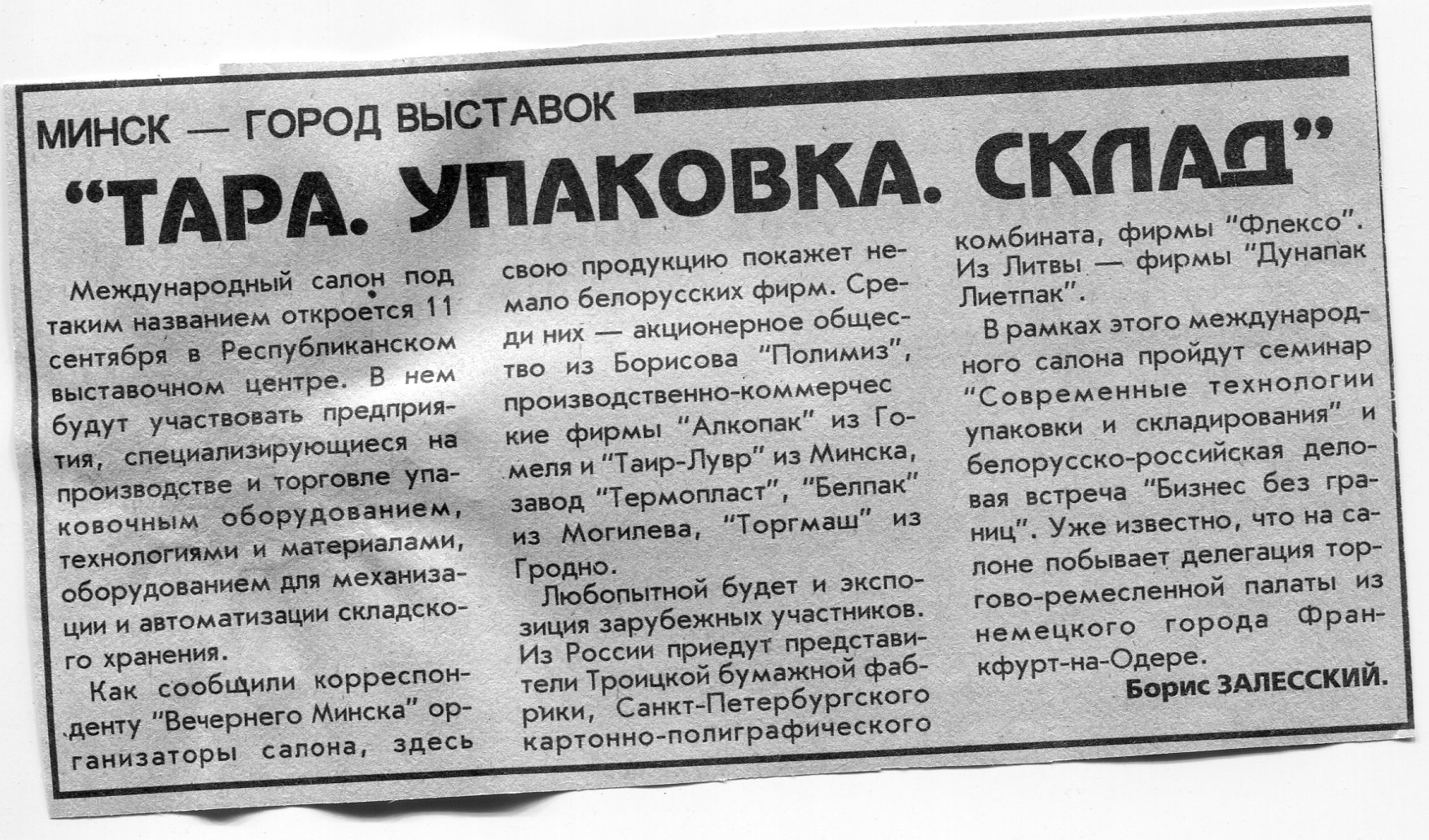 Залесский, Б. "Тара. Упаковка. Склад" / Б. Залесский // Вечерний Минск. - 1996. - 28 авг.