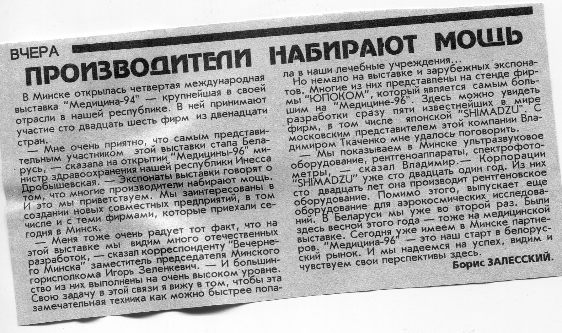 Залесский, Б. "Медицина-96" / Б. Залесский // Вечерний Минск. - 1996. - 27 авг.