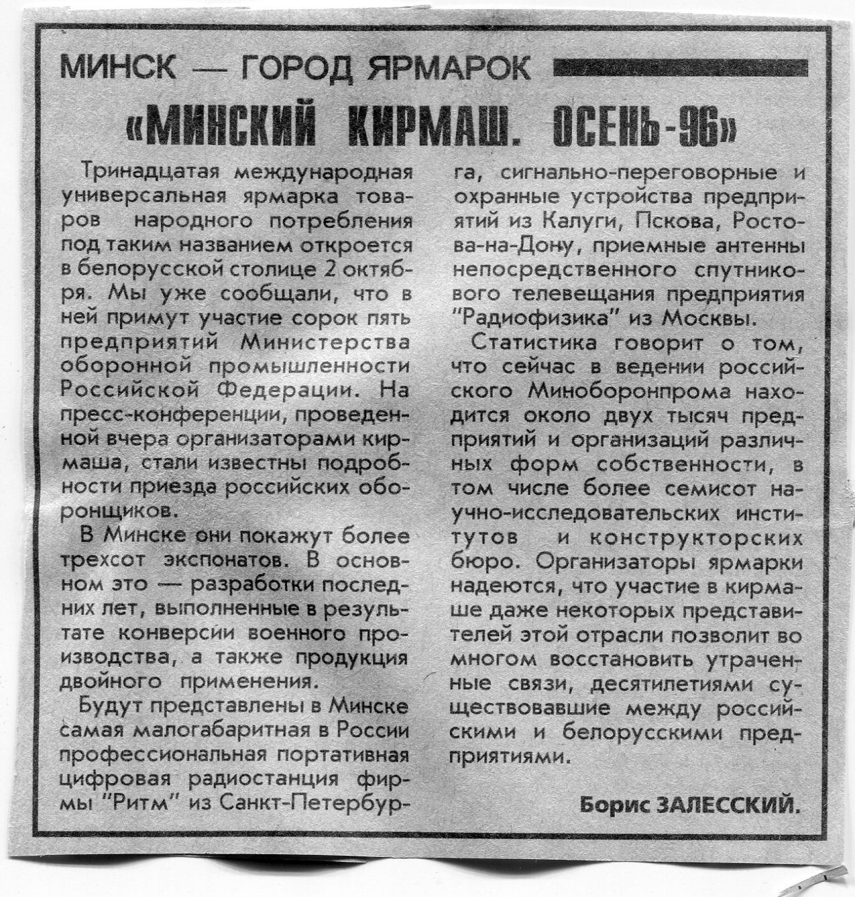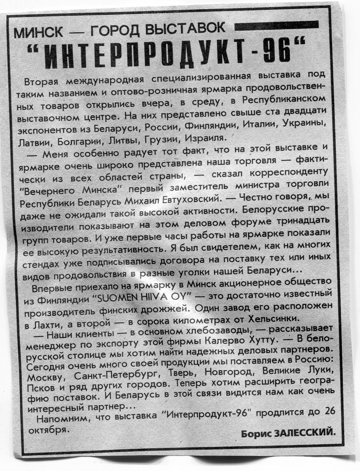 Залесский, Б. "Интерпродукт-96" / Б. Залесский // Вечерний Минск. - 1996. - 24 окт.