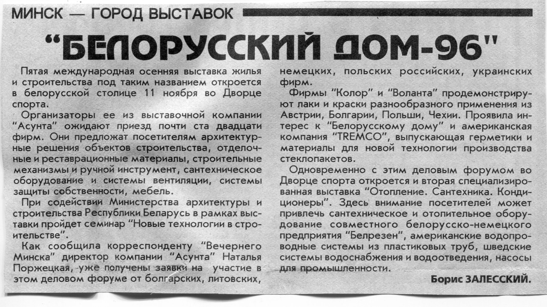 Залесский, Б. "Белорусский дом-96" / Б. Залесский // Вечерний Минск. - 1996. - 4 окт.