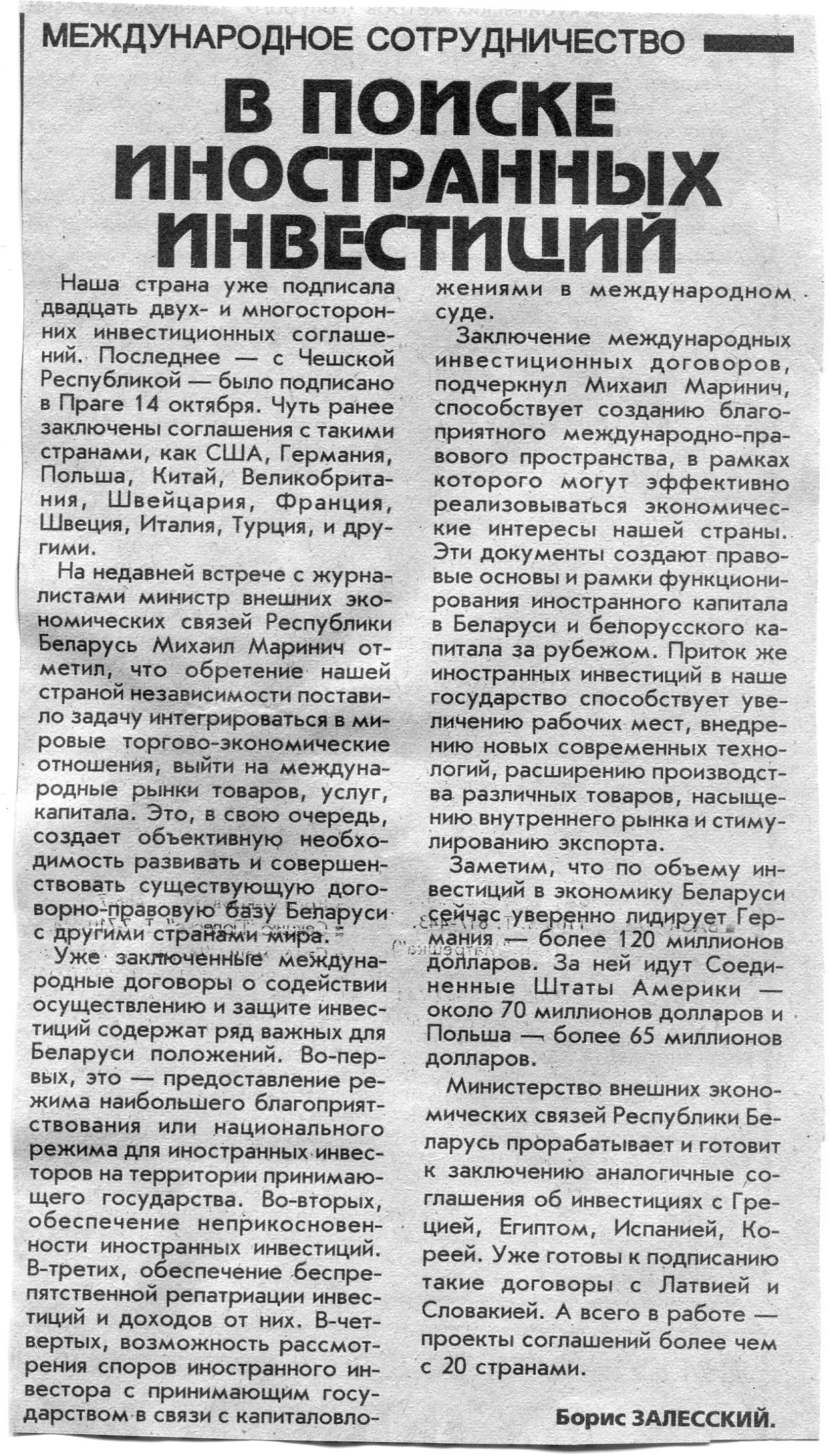 Залесский, Б. В поиске иностранных инвестиций / Б. Залесский // Вечерний Минск. - 1996. - 25 окт.