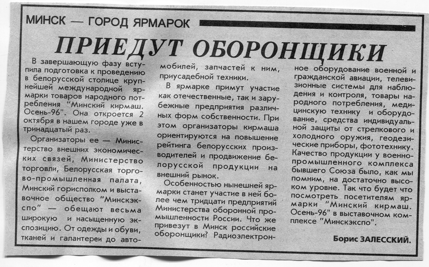 Залесский, Б. Приедут оборонщики / Б. Залесский // Вечерний Минск. - 1996. - 16 сент.