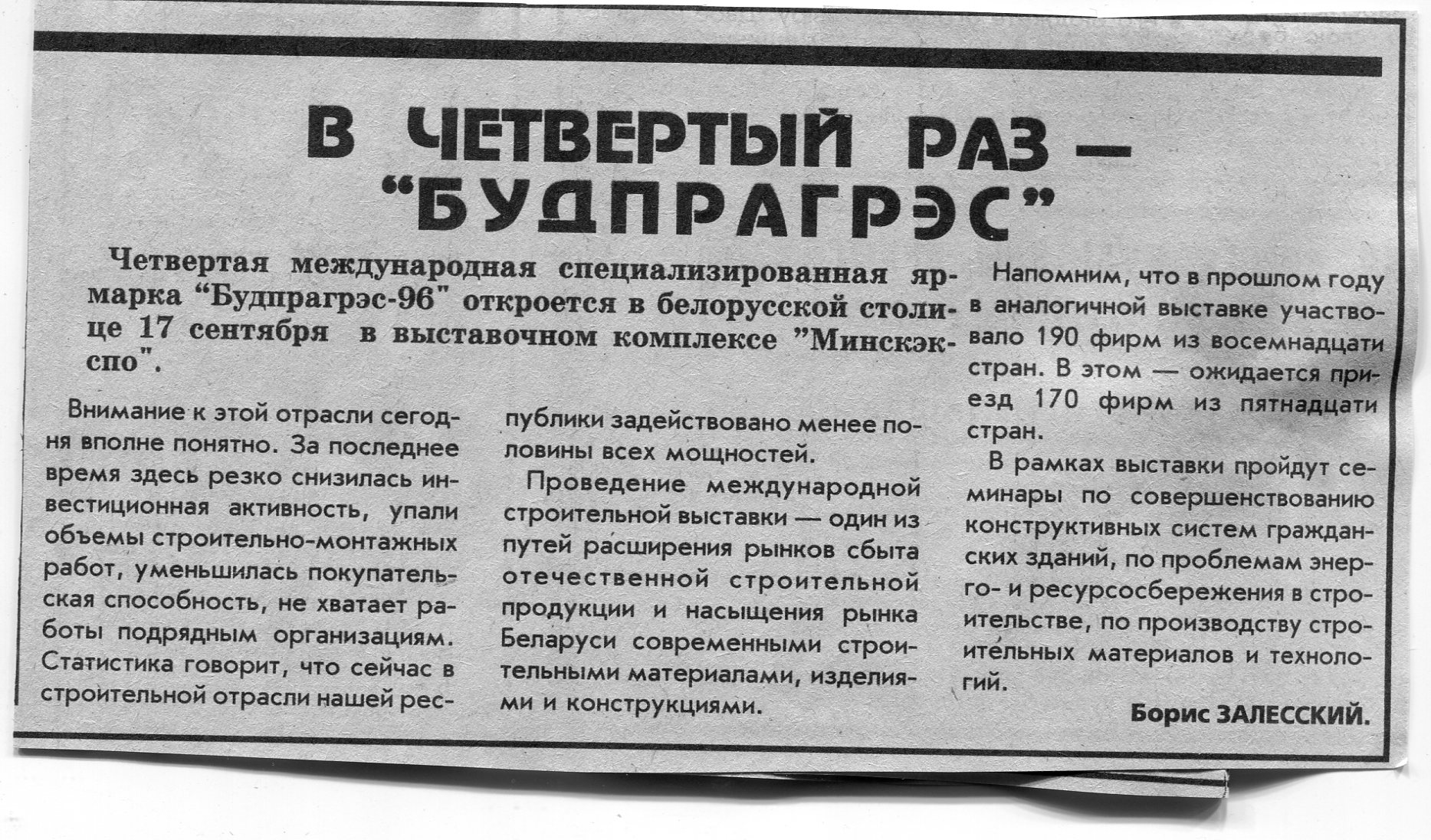 Залесский, Б. В четвертый раз - "Будпрагрэс" / Б. Залесский // Вечерний Минск. - 1996. - 30 авг.