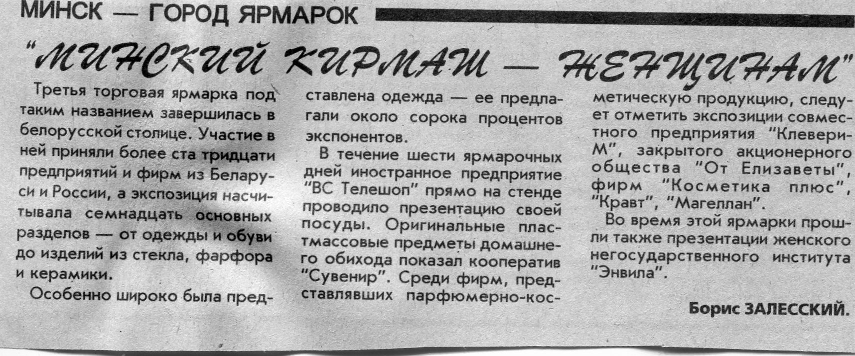 Залесский, Б. "Минский кирмаш - женщинам" / Б. Залесский // Вечерний Минск. - 1996. - 11 мар.