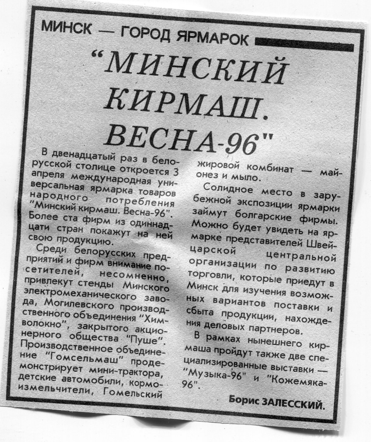Залесский, Б. "Минский кирмаш. Весна-96" / Б. Залесский // Вечерний Минск. - 1996. - 2 апр.