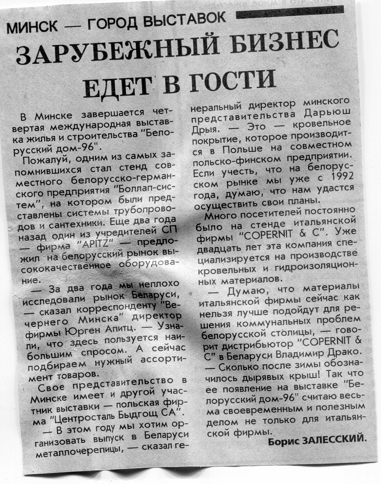 Залесский, Б. Зарубежный бизнес едет в гости / Б. Залесский // Вечерний Минск. - 1996. - 29 мар.