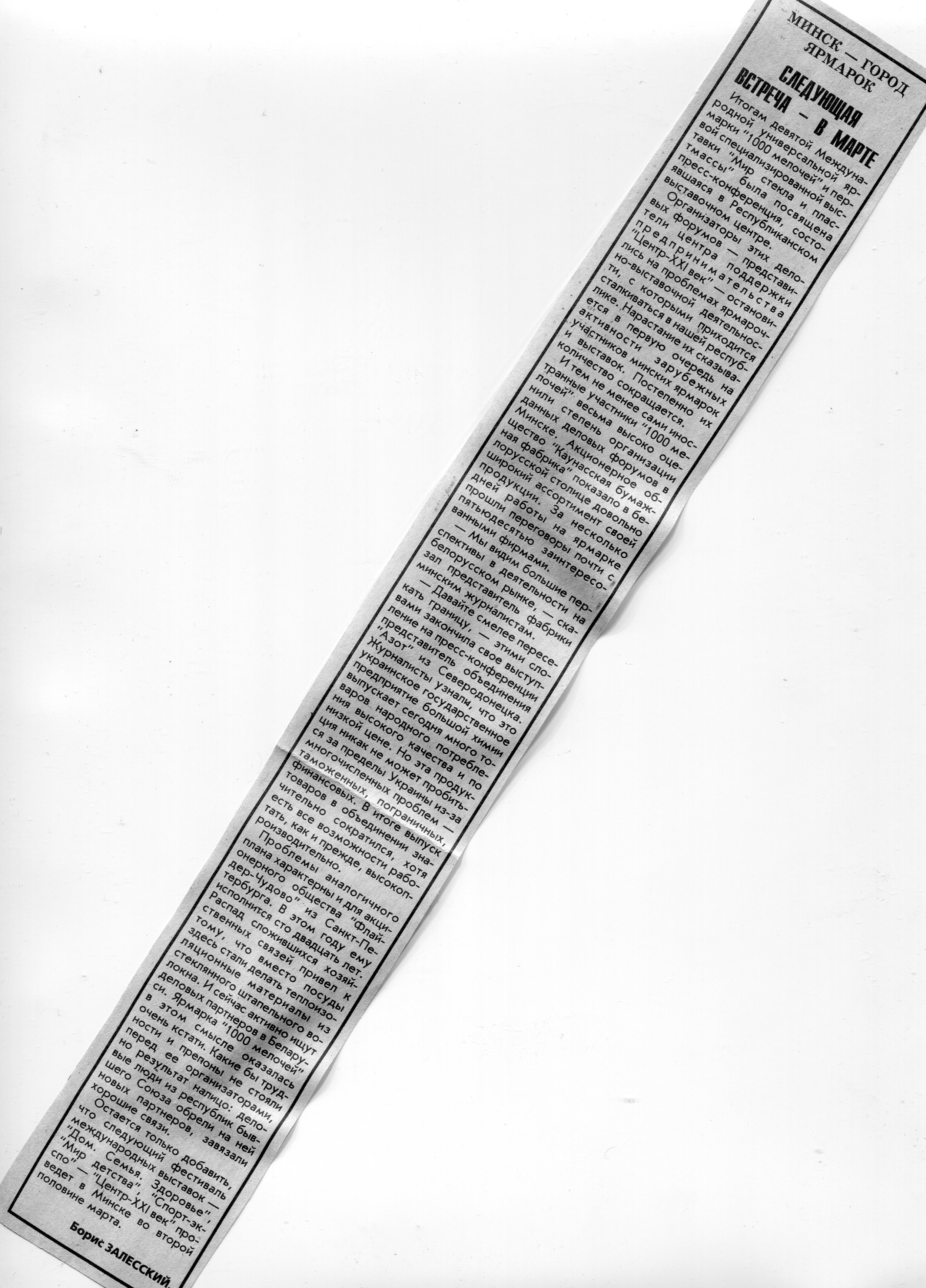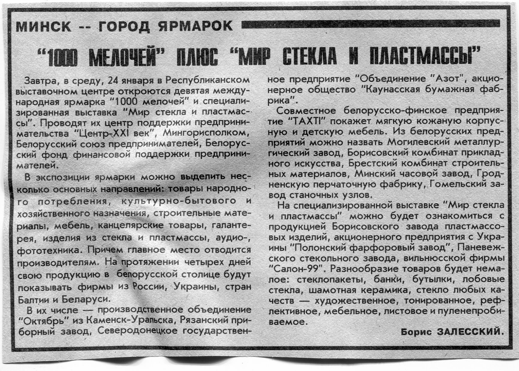 Залесский, Б. "1000 мелочей" плюс "Мир стекла и пластмассы" / Б. Залесский // Вечерний Минск. - 1996. - 23 янв.