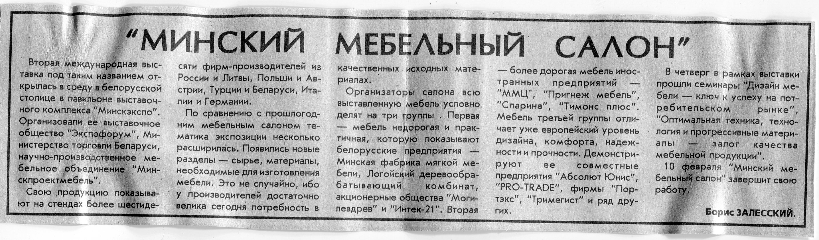 Залесский, Б. "Минский мебельный салон" / Б. Залесский // Вечерний Минск. - 1996. - 8 февр.