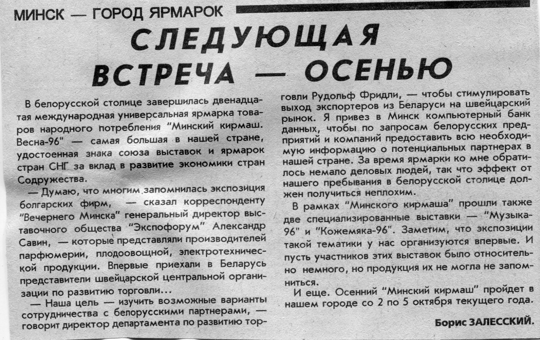 Залесский, Б. Следующая встреча - осенью / Б. Залесский // Вечерний Минск. - 1996. - 9 апр.