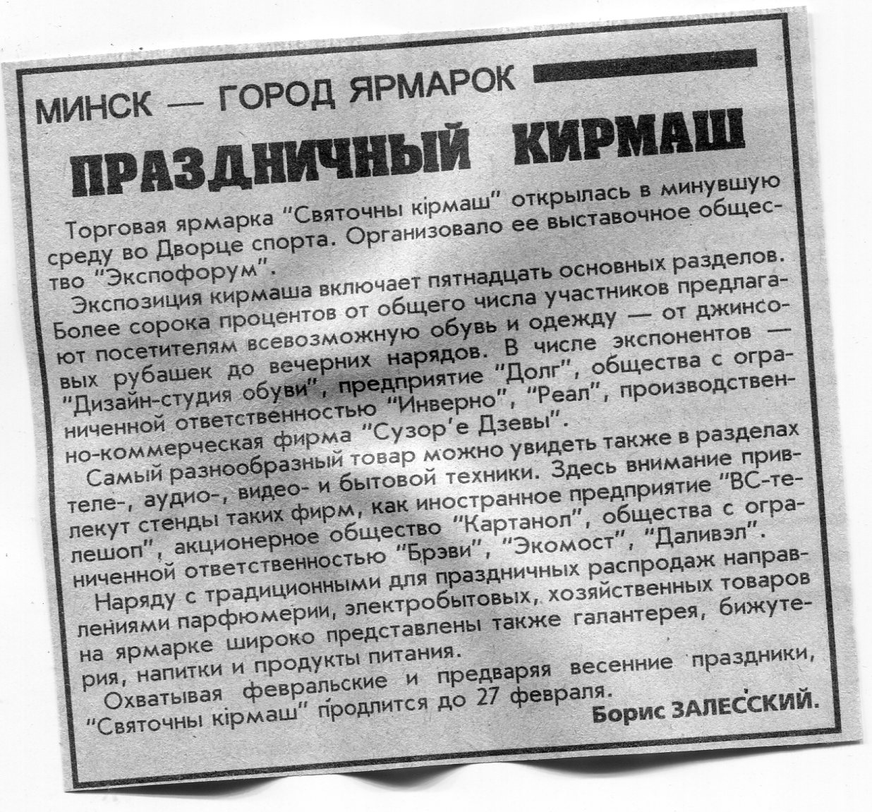 Залесский, Б. Праздничный кирмаш / Б. Залесский // Вечерний Минск. - 1996. - 16 февр.