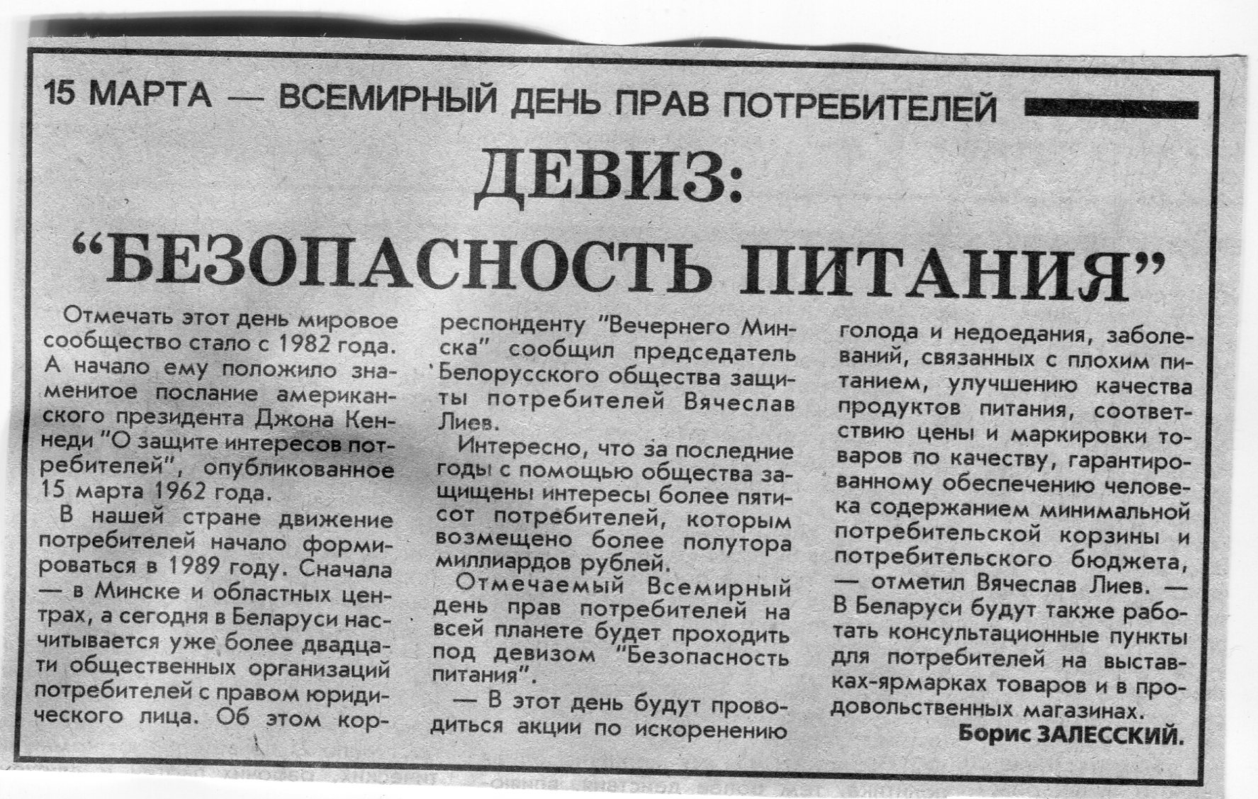 Залесский, Б. 15 марта - Всемирный день прав потребителей / Б. Залесский // Вечерний Минск. - 1996. - 11 мар.