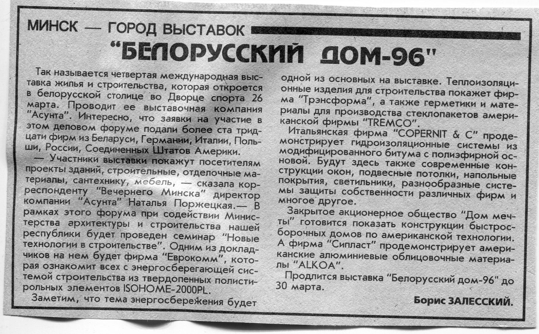 Залесский, Б. "Белорусский дом-96" / Б. Залесский // Вечерний Минск. - 1996. - 20 мар.
