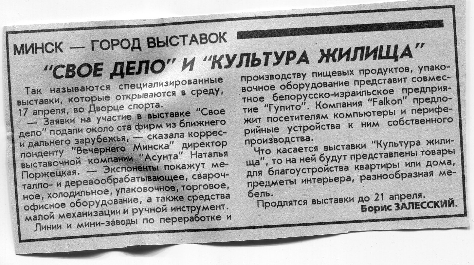 Залесский, Б. "Свое дело" и "Культура жилища" / Б. Залесский // Вечерний Минск. - 1996. - 16 апр.