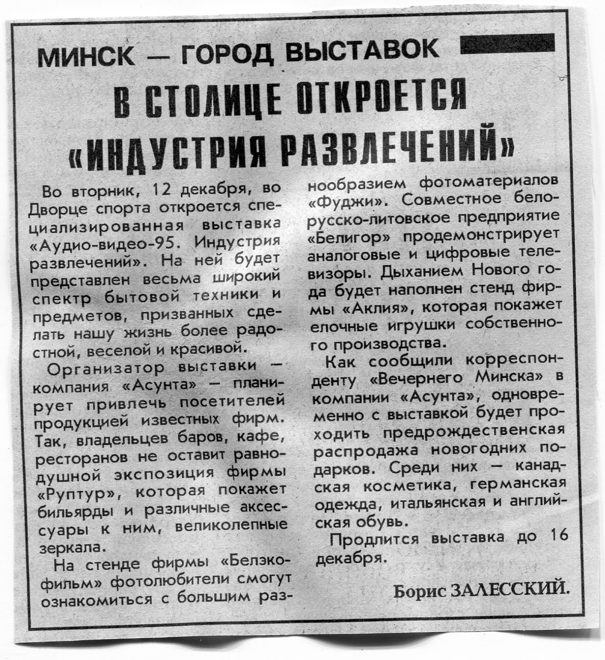 Залесский, Б. В столице откроется "Индустрия развлечений" / Б. Залесский // Вечерний Минск. - 1995. - 11 дек.