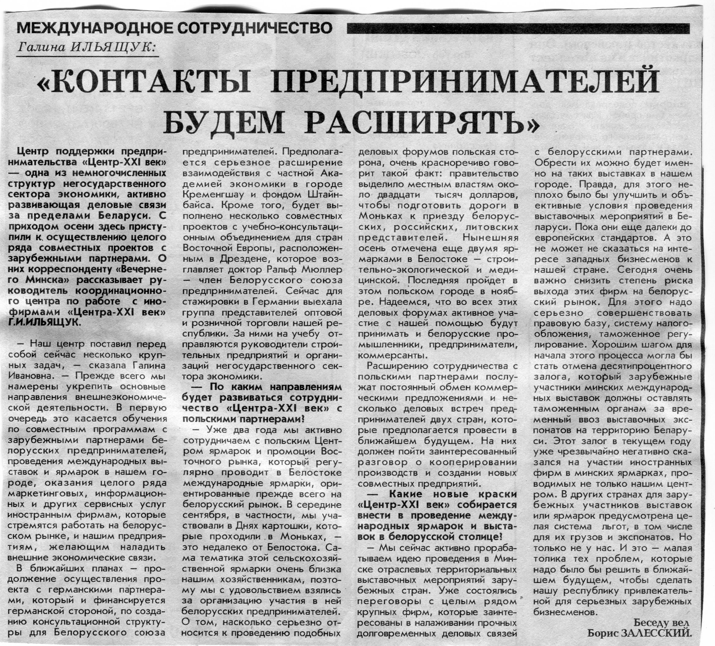 Залесский, Б. Галина Ильящук: "Контакты предпринимателей будем расширять" / Б. Залесский // Вечерний Минск. - 1995. - 16 окт.
