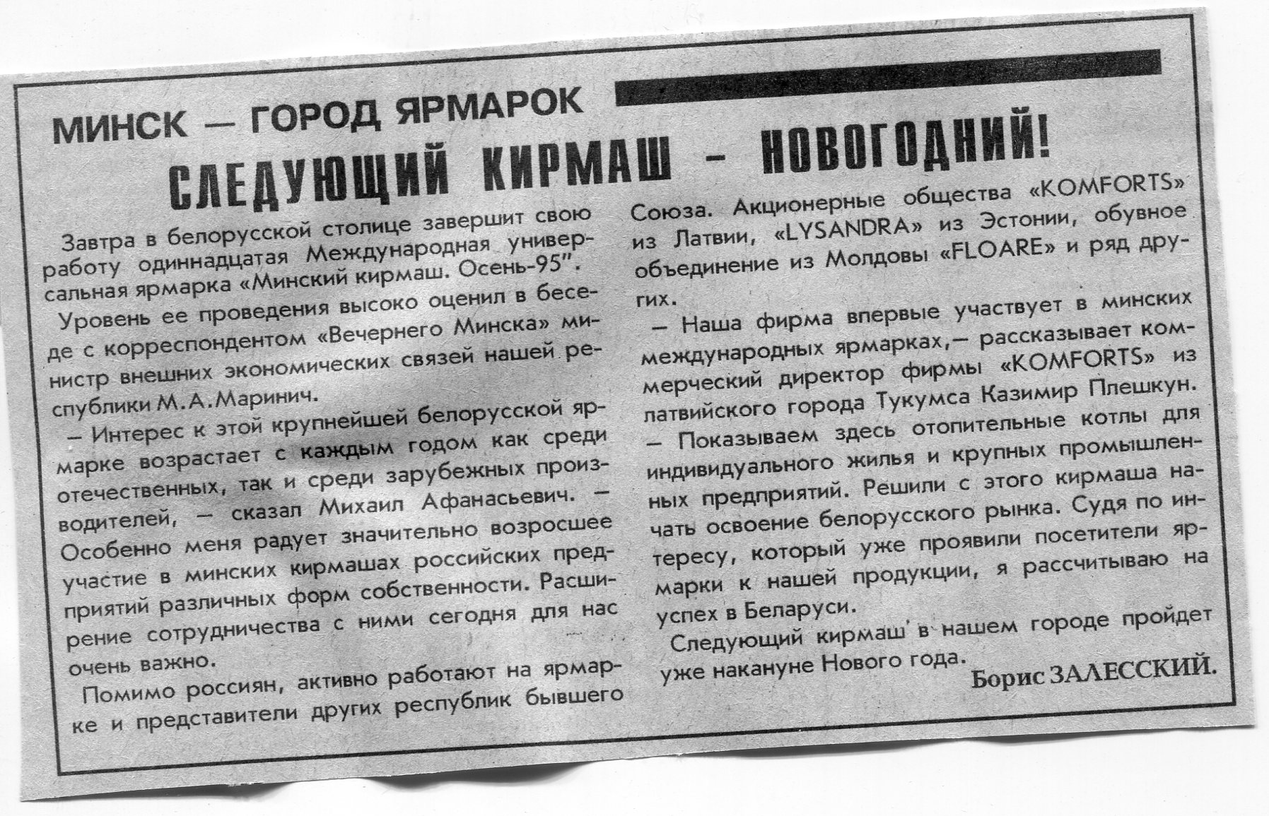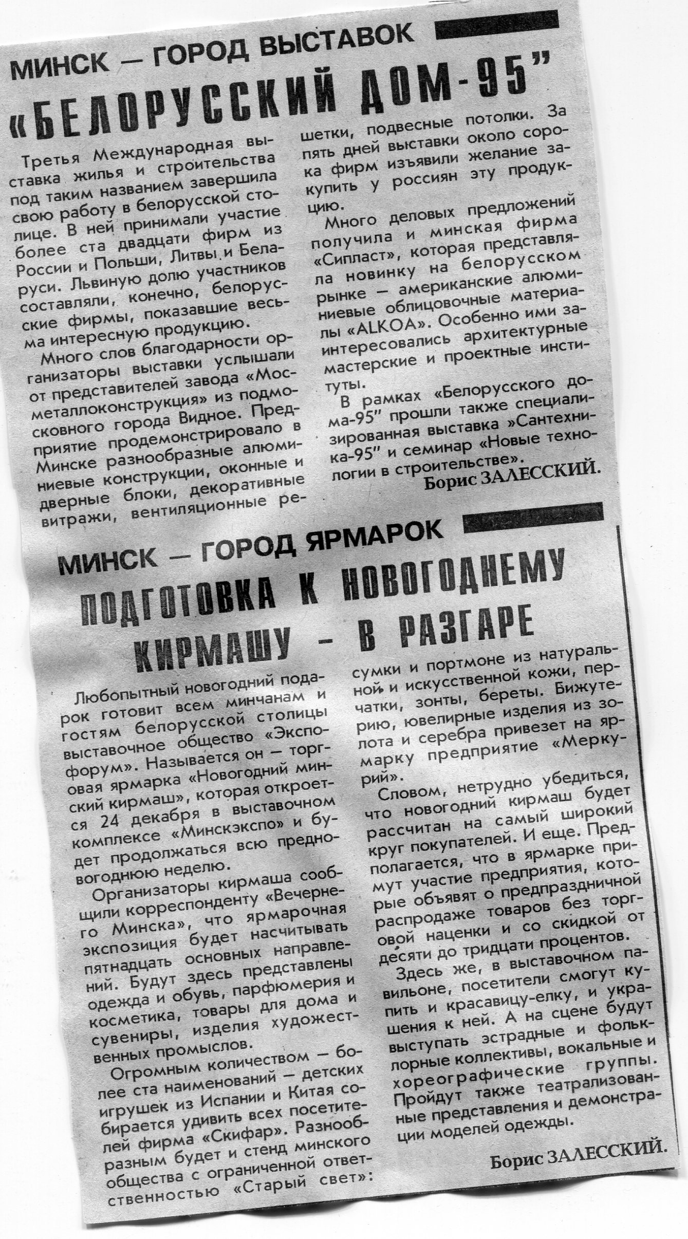 Залесский, Б. Следующий кирмаш - новогодний / Б. Залесский // Вечерний Минск. - 1995. - 6 окт.