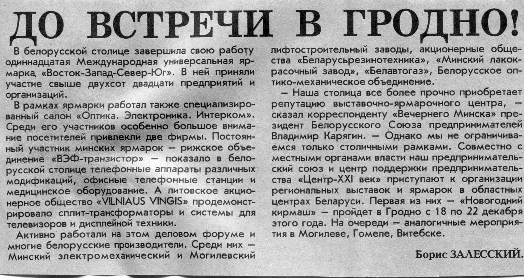 Залесский, Б. До встречи в Гродно / Б. Залесский // Вечерний Минск. - 1995. - 5 дек.