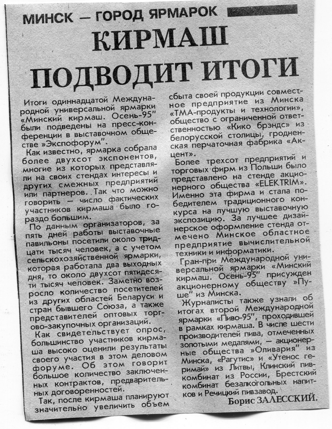 Залесский, Б. Кирмаш подводит итоги / Б. Залесский // Вечерний Минск. - 1995. - 12 окт.