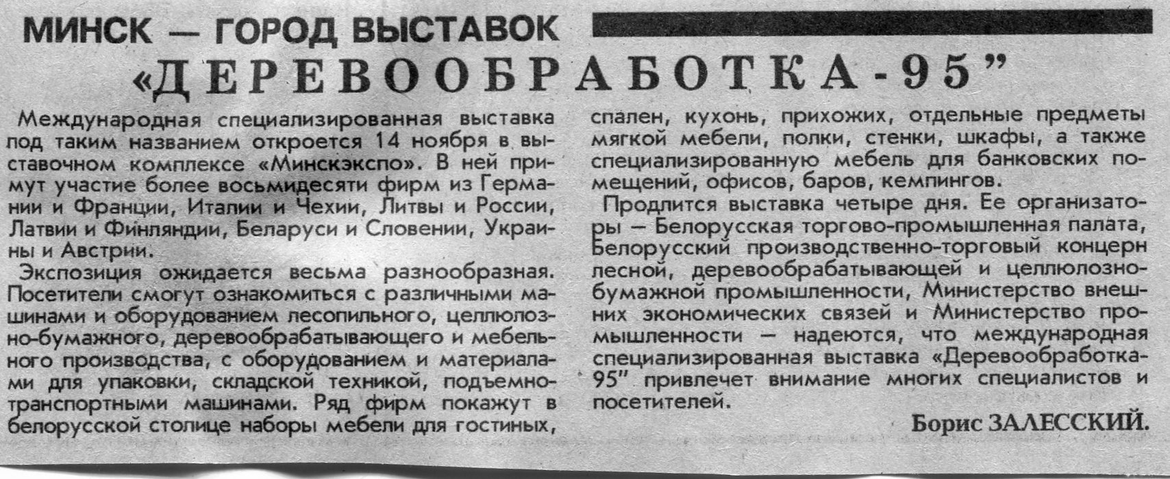 Залесский, Б. "Деревообработка-95" / Б. Залесский // Вечерний Минск. - 1995. - 10 нояб.