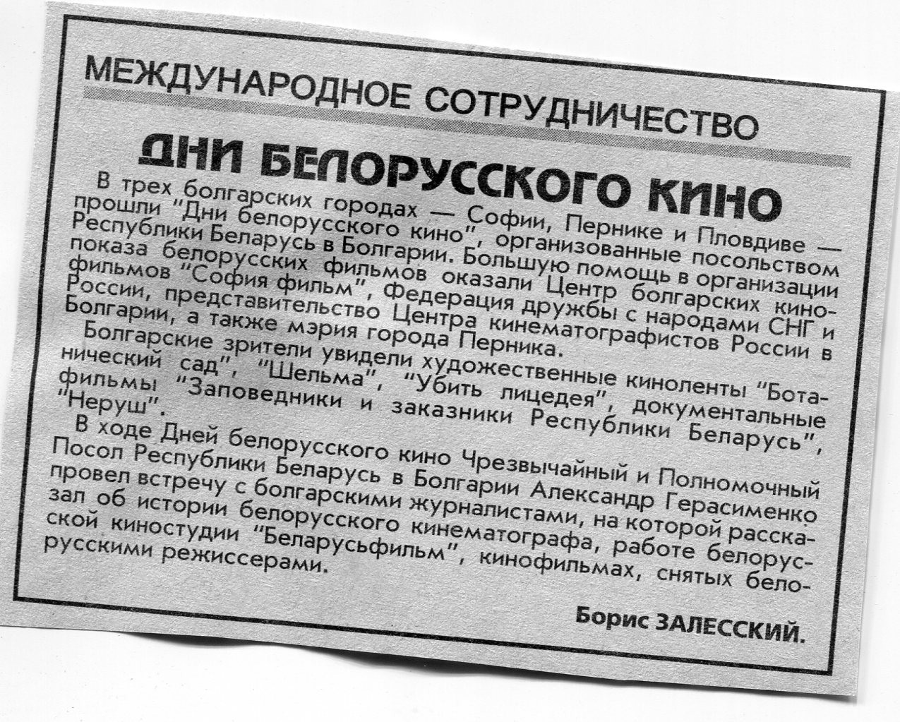 Залесский, Б. Дни белорусского кино / Б. Залесский // Вечерний Минск. - 2000. - 20 янв.