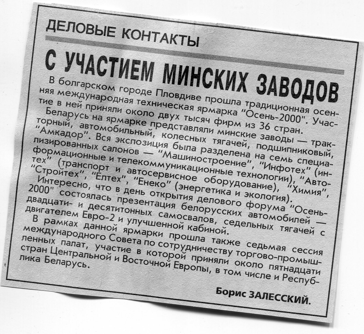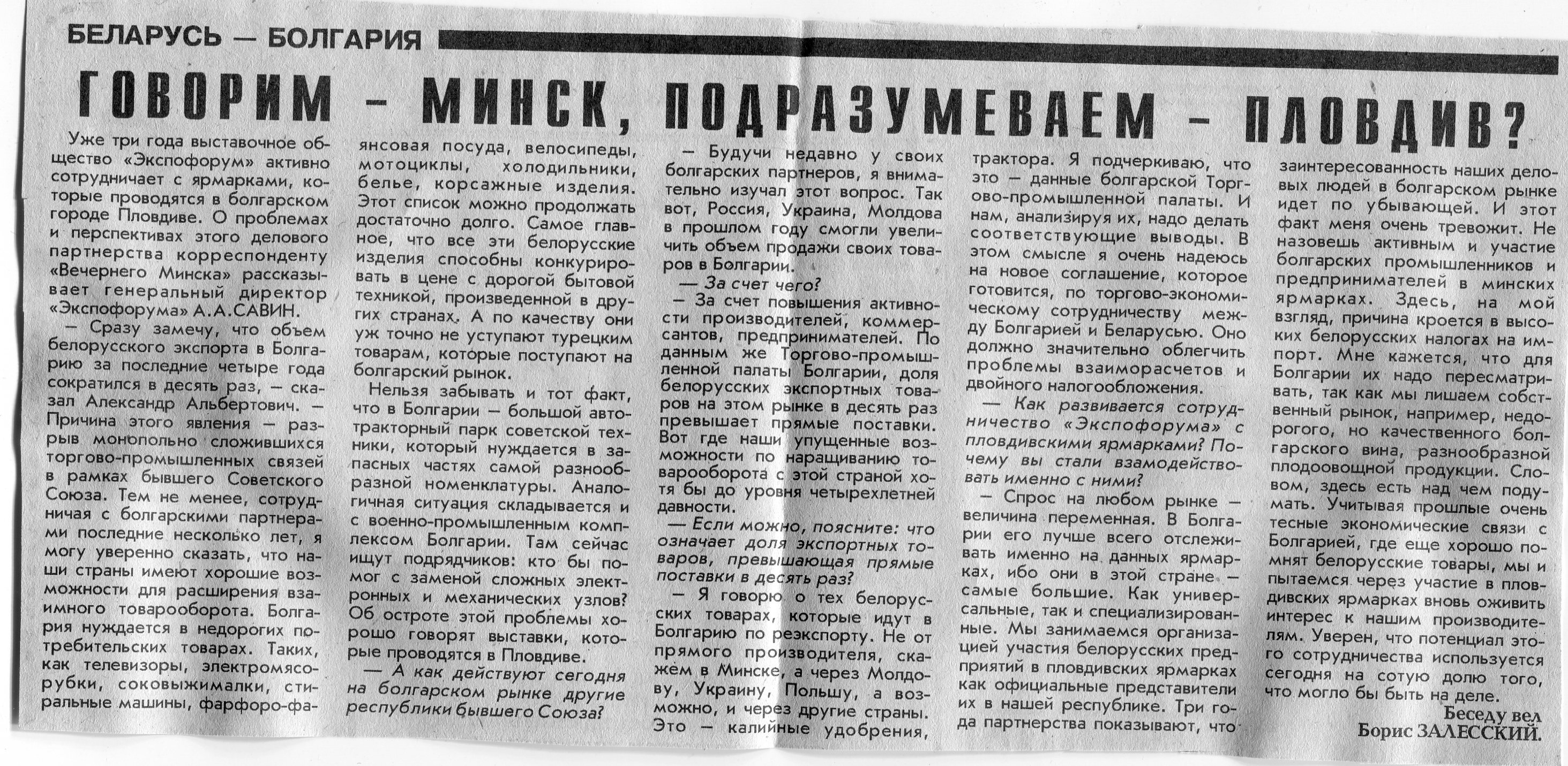 Залесский, Б. На ярмарку - в Пловдив / Б. Залесский // Вечерний Минск. - 1996. - 22 июл.
