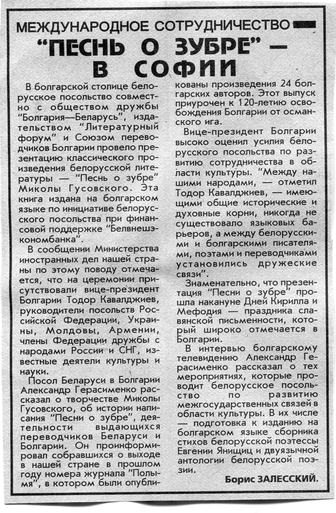 Залесский, Б. "Песнь о зубре" - в Софии / Б. Залесский // Вечерний Минск. - 1998. - 3 июн.