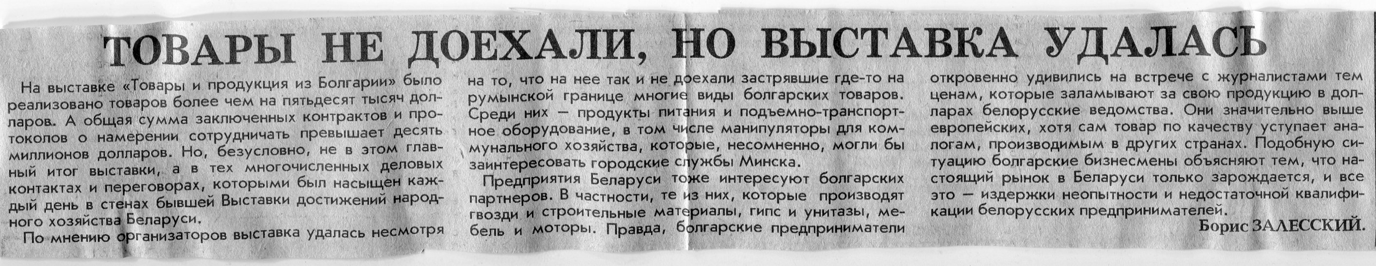 Залесский, Б. Товары не доехали, но выставка удалась / Б. Залесский // Вечерний Минск. - 1993. - 21 сент.